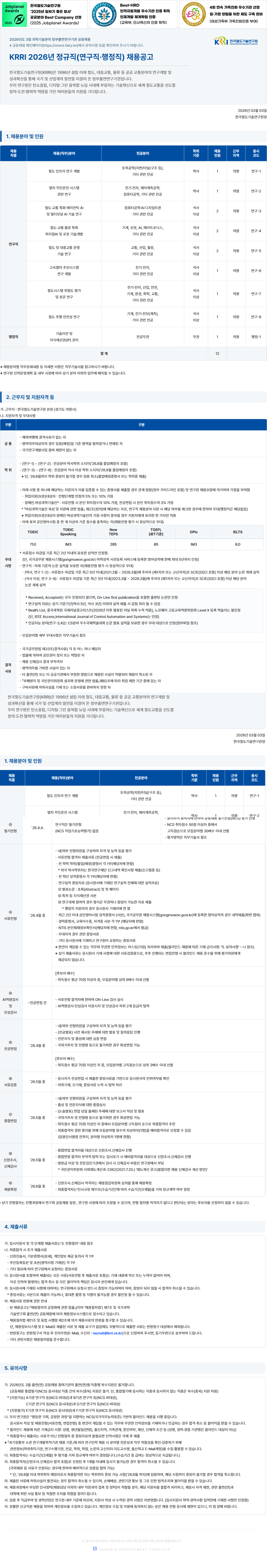 ํ•œ๊ตญ์ฒ ๋„๊ธฐ์ˆ ์—ฐ๊ตฌ์›(KRRI) 2026๋…„ ์ •๊ทœ์ง(์—ฐ๊ตฌ์งยทํ–‰์ •์ง) ์ฑ„์šฉ ์ฑ„์šฉ๊ณต๊ณ  - ์žกํ”„๋žฉ